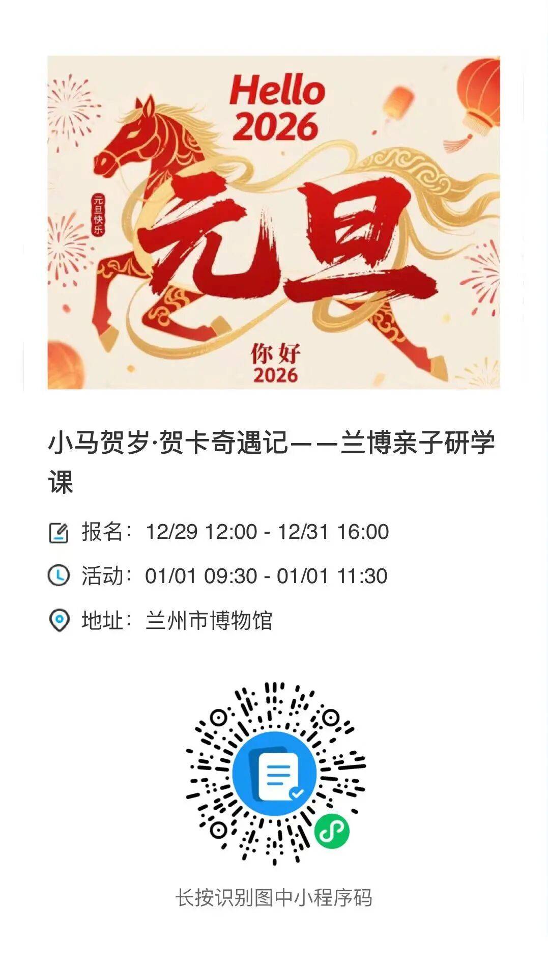 活动时间为 2026 年 1 月 1 日上午 9:30,地点在兰州市博物馆二楼报告厅。此次活动旨在让青少年了解春节民俗和十二生肖文化寓意,培养动手创新能力,促进亲子互动,厚植文化自信与家国情怀。欢迎大家参与!